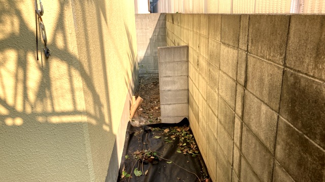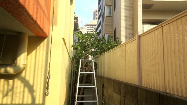 左の建物の1階の窓が完全に覆われてしまっていたので、それだけでも問題でしたが、隣地に枝が伸びてしまったので、ご近所トラブルにならないように、撤去することにしました。