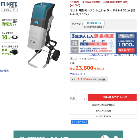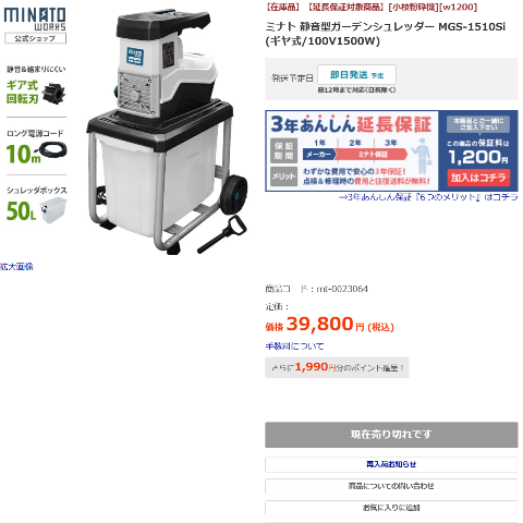 中間の機種はギア回転刃式で粉砕効率が良さそう、逆回転もできるので保守性が高い気がします。残念ながら、今日の時点で品切れらしく、入荷の目途も立たないみたいです。公式サイトでは39,800円と表示されているので、下位機種より16,000円高です。