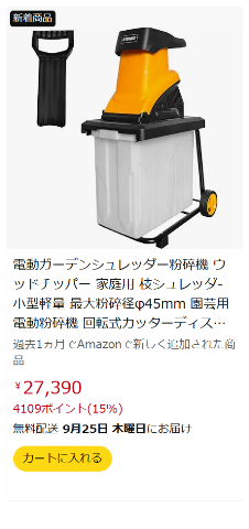 ガーデンシュレッダーなどと呼ばれる粉砕機を使うことで、枝が粉々になり、ゴミ袋に入れて捨てるにしても手軽で軽量、チップを庭に撒けば肥料にもなり得るということで、リーズナブルな感じになりました。