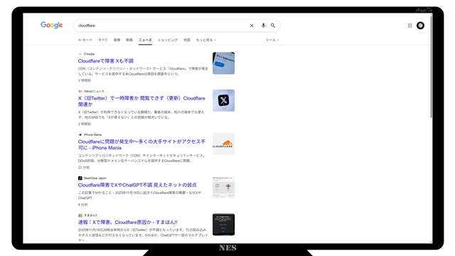 Googleで『Cloudflare』を検索したところ、障害が出ているらしい記事がたくさんリストされました。