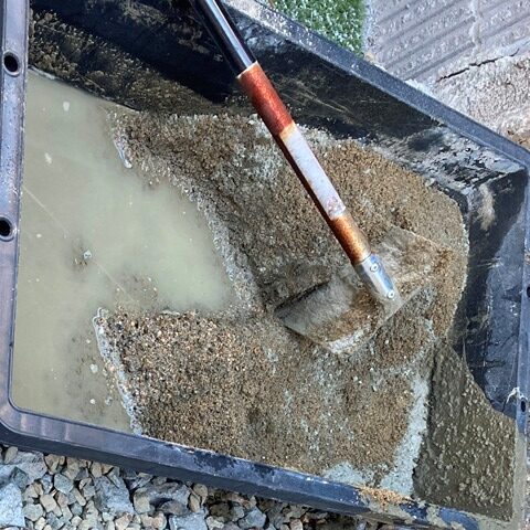 整地後にバラス(砂利)を敷き、コンクリートで固めました。今回はセメント1に対して砂3の割合、これをバラスの上に流し込みました。