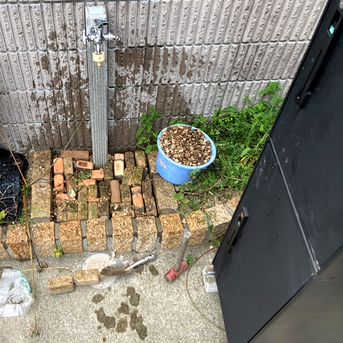 仕上がった様子が下図です。雑草だらけだった場所は土間になりました。近くに置いていた石も不要になったので一緒に埋めました。