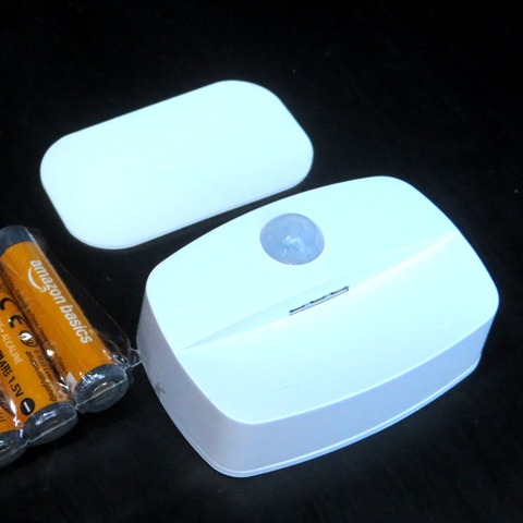 今回の調達品は電池式の夜間人感センサー付き照明です。過去に仮設トイレ用に調達したことがあったので、使い勝手はわかっていました。乾電池は別売品でしたのでAmazon Basicsのものを6本用意しています。