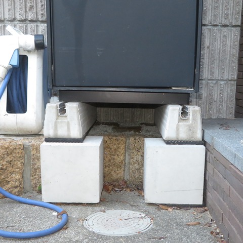 見えづらいですが、土間部分もピンコロ部分も、防振ゴムを敷いて高さの微調整をしています。防振ゴムはエアコン室外機で多用しているものです。カッターナイフで簡単に切れる10ミリ厚、10センチ幅の物を使いました。