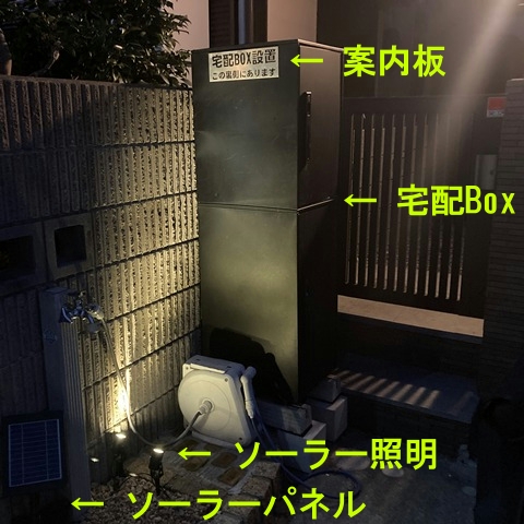 近くに電源は無かったのですが、ソーラー充電式の庭園灯で宅配ボックスと案内板をライトアップしてみました。