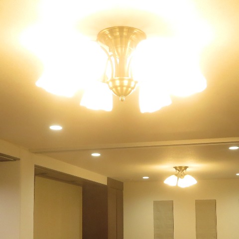 シャンデリアから派生したような、ガラス細工があるような器具や、真鍮フレームの器具などは、ロウソクから連想されるような電球色が似合うかもしれません。
