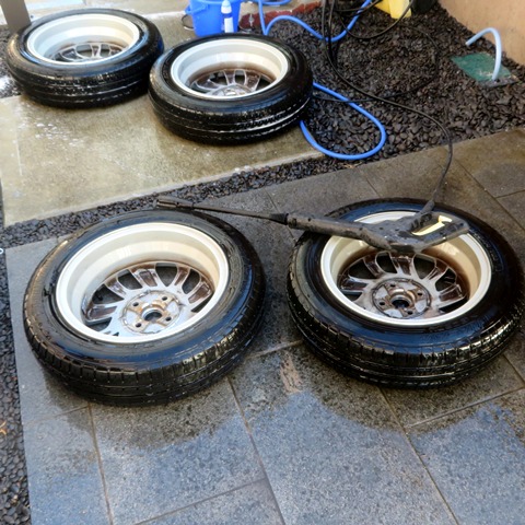 外したタイヤは、それなりに汚れています。せっかくなのでケルヒャーの高圧洗浄機で洗いました。