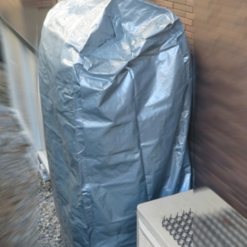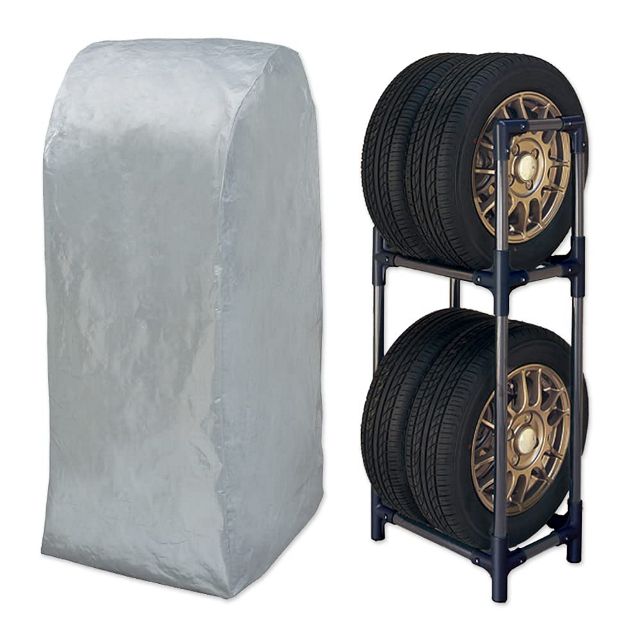 お隣さんとの境界近く、家の横にラックを置いて、タイヤを載せて、カバーを掛けたら数か月後まで放置です。