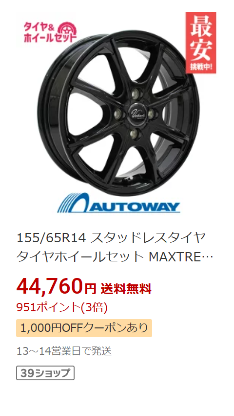 このタイヤとホイールを買っただけで41,160円、ホイールにタイヤを取り付ける工賃も加えると、37,500円は経済的な価格だなと思います。