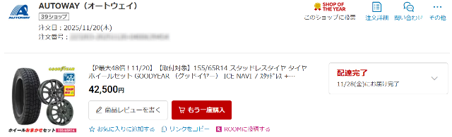 もし、軽ワゴンで配達、不在だとタイヤ4本を持ち歩くのでお困りになるだろうと思い、確実に在宅している日に配達日を指定しました。