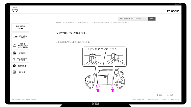 まず、車の取扱説明書でジャッキアップポイントを確認します。車載の取扱説明書は分厚い冊子、検索性に優れているとは言い難いので、ネットで調べた方が早いかもしれません。