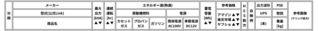 停電時に使用する非常用電源としての発電機、蓄電池の比較ができるデータベースについて。