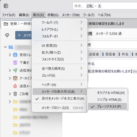 Altキーを押すとトップのメニューが表示されるので、そこから『表示』を選び、『メッセージの表示形式』から『プレーンテキスト』を選びます。