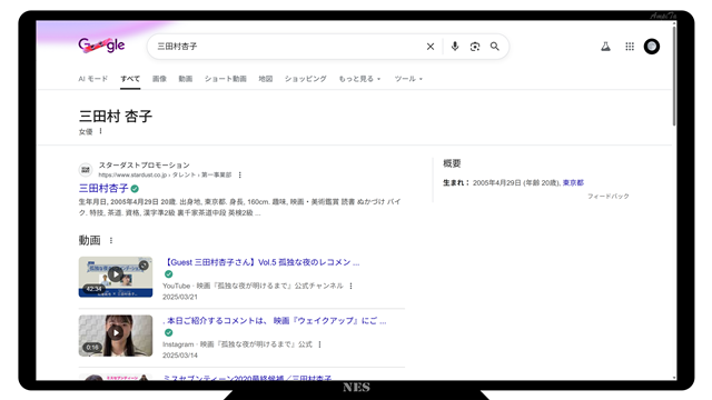 同様に『三田村杏子』も検索したところ、最上位はYouTubeでも話していたスターダストプロモーションの公式サイト、2位以下には動画がいくつかリストされました。写真集も出されているようなので、ネット通販のサイトも表示されました。